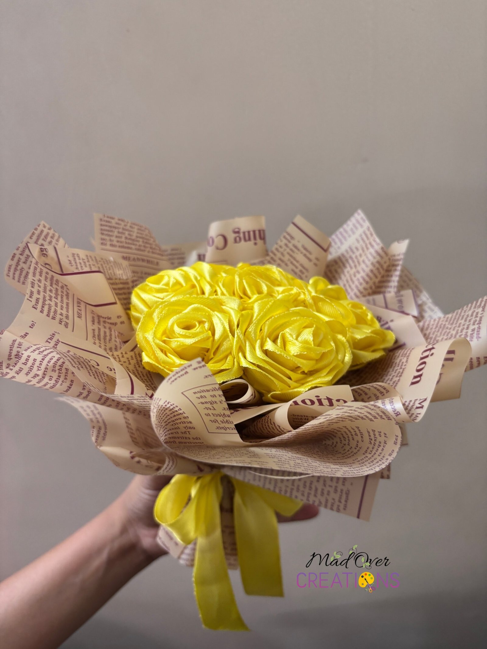 Add a pop of sunshine to any occasion with our handcrafted yellow satin rose bouquet. Each rose is carefully made with high-quality satin ribbon and arranged in an eco-friendly, vintage-style paper wrap. Finished with a soft yellow satin bow, this bouquet makes a perfect gift for birthdays, anniversaries, or just to brighten someone’s day.